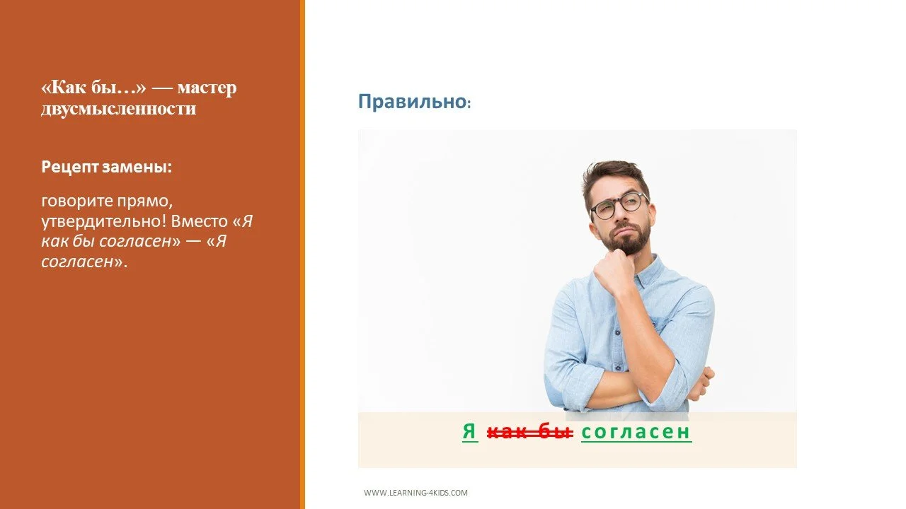 Рецепт замены: Говорите прямо, утвердительно! Вместо «Я как бы согласен» — «Я согласен». Видите, как сразу прибавилось уверенности!