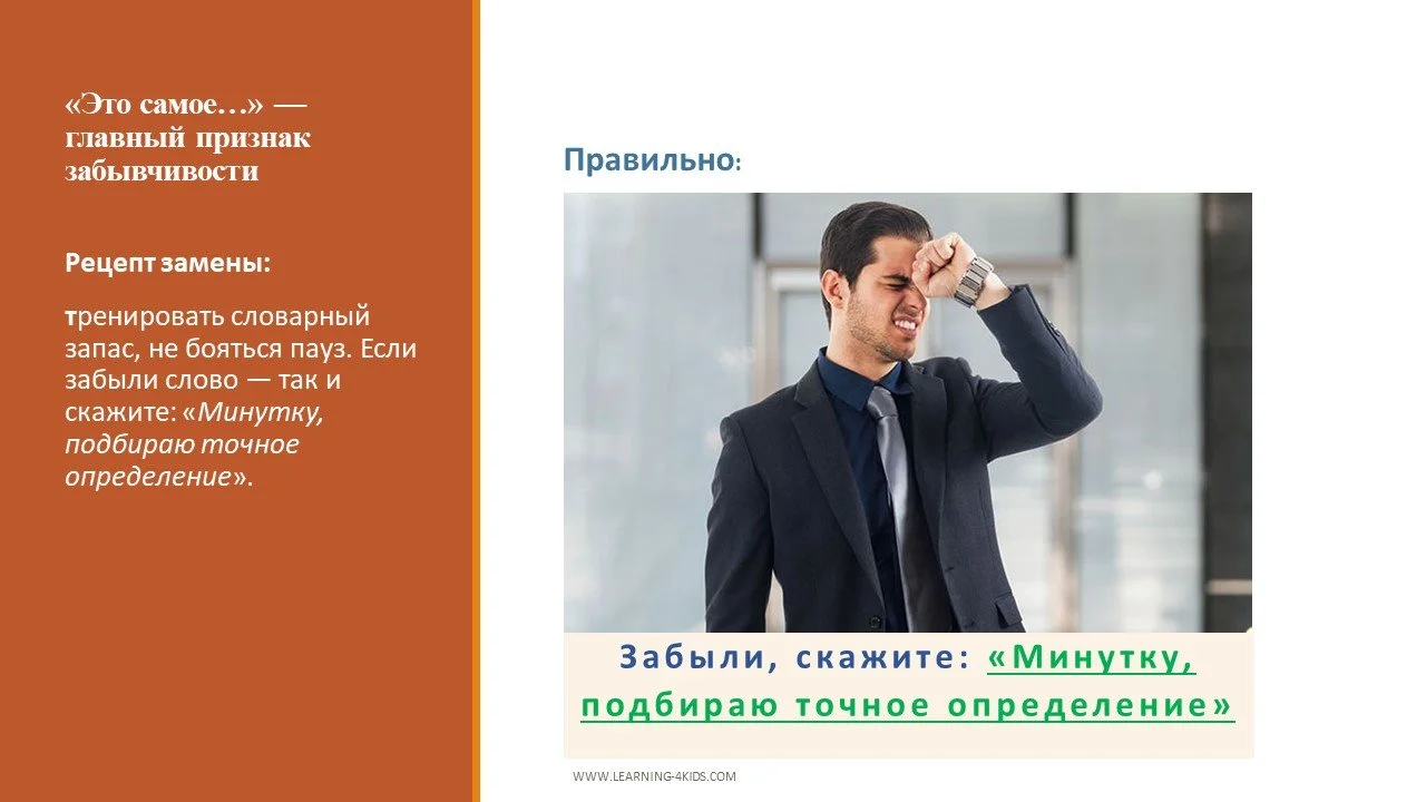 Рецепт замены: Тренировать словарный запас, не бояться пауз. Если забыли слово — так и скажите: «Минутку, подбираю точное определение». Это звучит честно и профессионально.