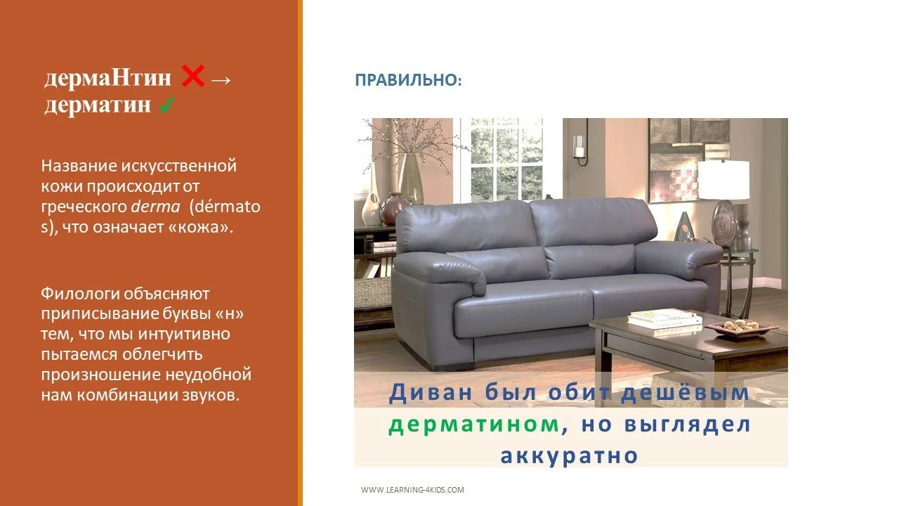 дермаНтин ❌→ дерматин ✔ (не «мантия», а искусственная кожа)