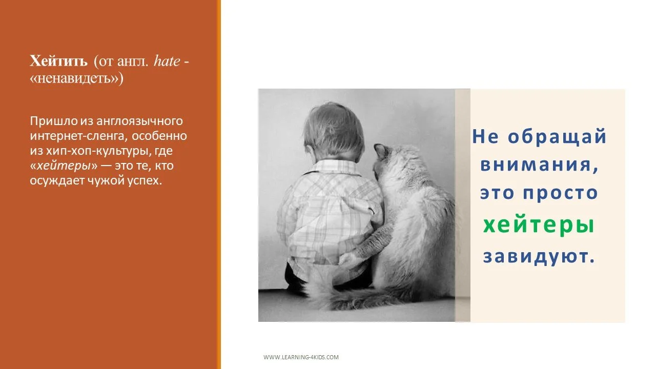 Пришло из англоязычного интернет-сленга, особенно из хип-хоп-культуры, где «хейтеры» — это те, кто осуждает чужой успех. В русский язык слово проникло через соцсети и блоги.