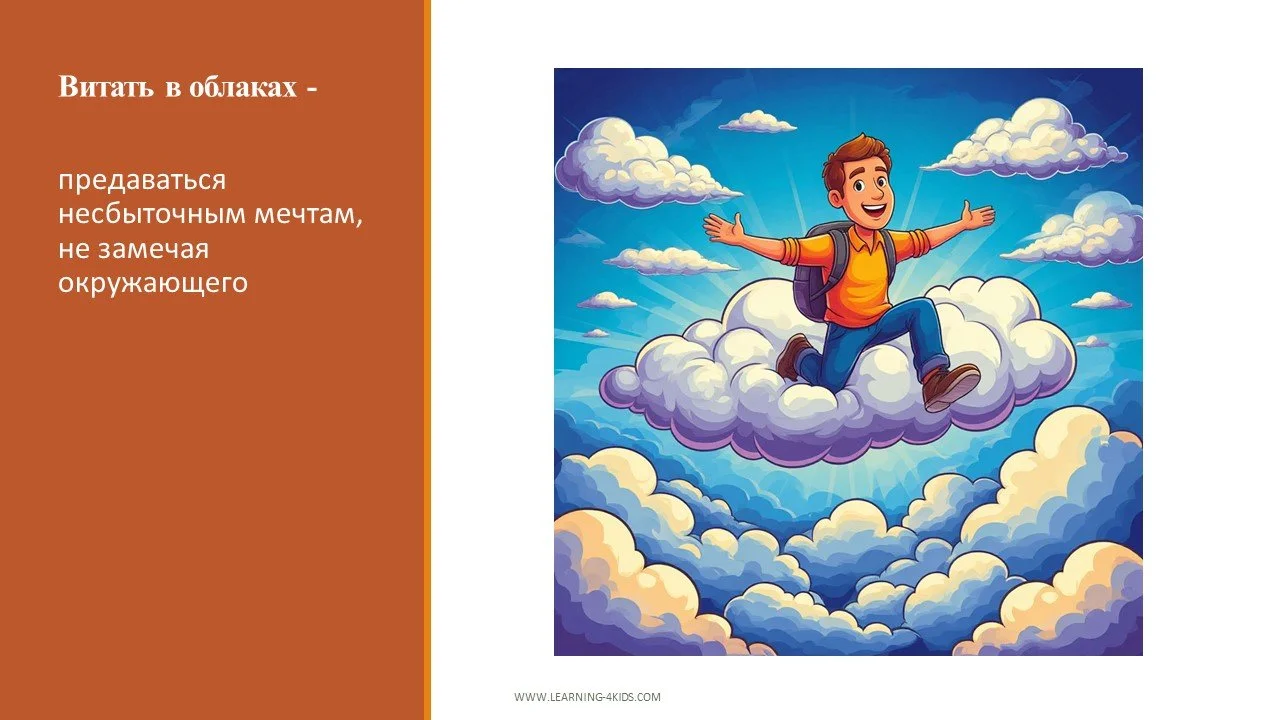 А мамам и папам предлагаю увлекательную «обучалку» на примере одного фразеологического оборота «витать в облаках», которая поможет вашему ребенку открыть для себя удивительный мир русского образного языка!