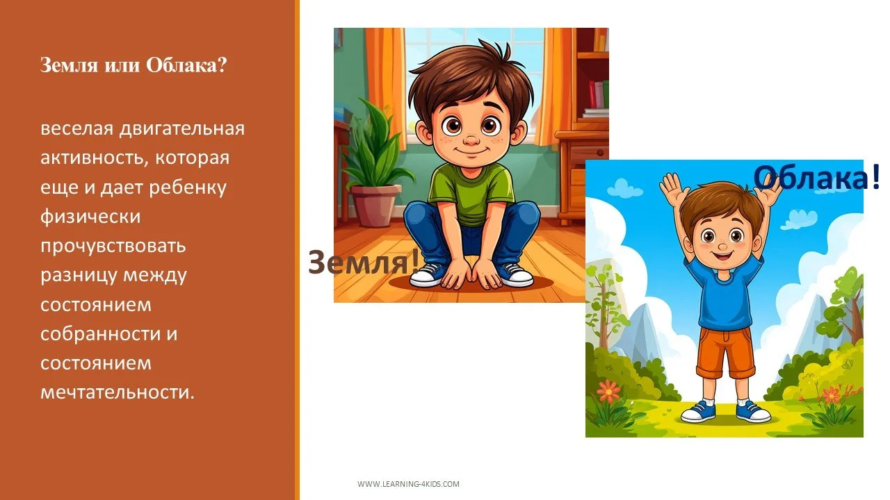 «Земля или Облака?» - веселая двигательная активность, которая еще и дает ребенку физически прочувствовать разницу между состоянием собранности и состоянием мечтательности.