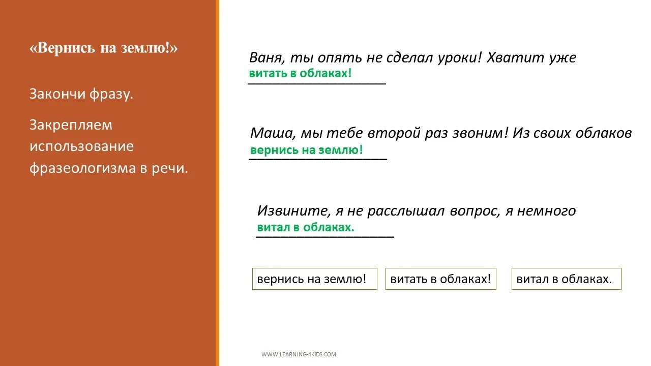 Взрослый начинает фразу, а ребёнок заканчивает её, используя «витать в облаках» или «вернись на землю».