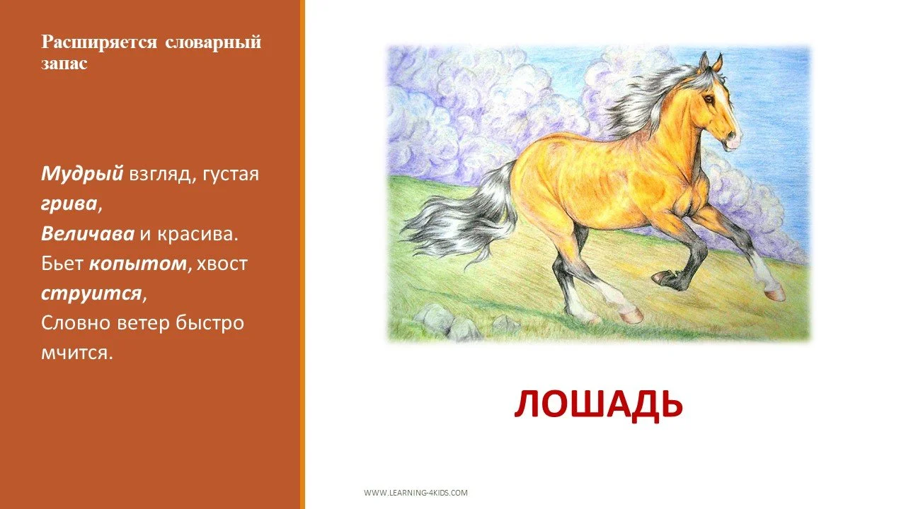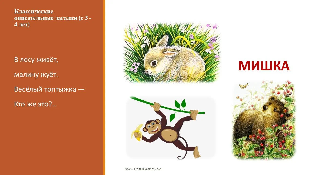 Формируется связная речь. Самый важный вопрос после отгадки: «А как ты догадался?». Это заставляет ребенка строить рассуждение, аргументировать свое мнение, используя сложные предложения («Я думаю, это лошадь, потому что у нее есть грива и копыта»).