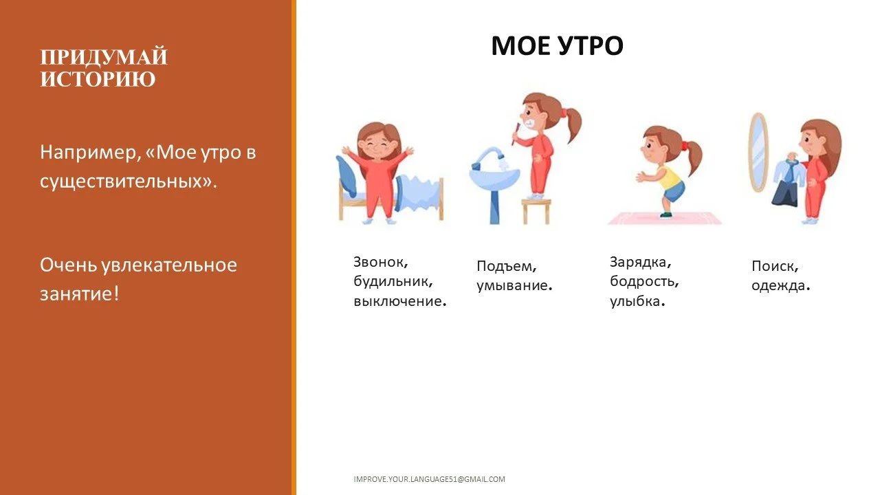 Придумывайте сами и предложите ребенку составить короткий рассказ из слов, принадлежащих одной части речи. Опишите, например, свое утро, используя только существительные. «Звонок, будильник, выключение. Подъем, умывание. Зарядка, бодрость, улыбка. Поиск, одежда». По такому же принципу можно придумывать истории с одними глаголами или прилагательными. Очень увлекательное занятие, поверьте!